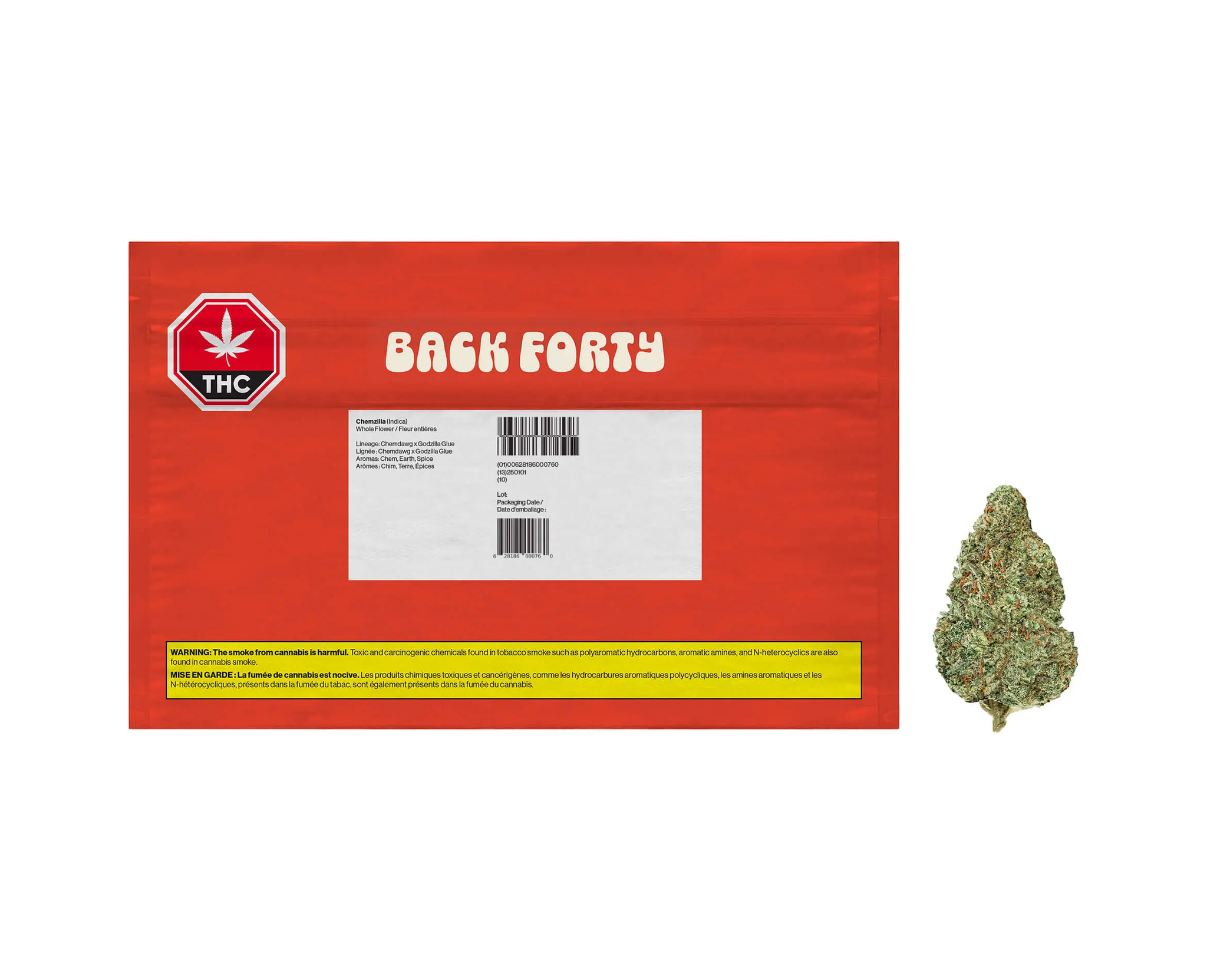 Brace yourselves, the secret is out on our latest monster: Chemzilla. It's a heavy Indica with Chemdawg x Godzilla Glue lineage. With aromas full of heavy earth and spicy chem, it's got a beast of a nose, top terpenes include Caryophyllene, Limonene, and Humulene. Buds are forest green in colour, coated in lavender-tinted trichomes. Back Forty flower always follows good weed protocol: always hang-dried, dry-trimmed, cured for 14 days, and sealed with a humidity pack.